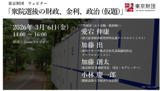 公益財団法人東京財団(東京都港区、理事長:中林美恵子)は、2026年3月6日(金)14時より、ウェビナー「衆院選後の財政・金利・政治 (仮題)」を開催いたします。