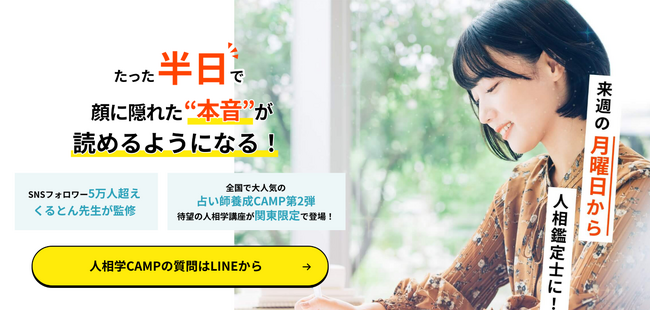 占いCAMPシリーズ第1弾のタロットと手相を土日で学ぶ占い師養成CAMPが全国47都道府県で大人気!第2弾はたった半日で人相鑑定ができるようになる人相学CAMPをリリースします。