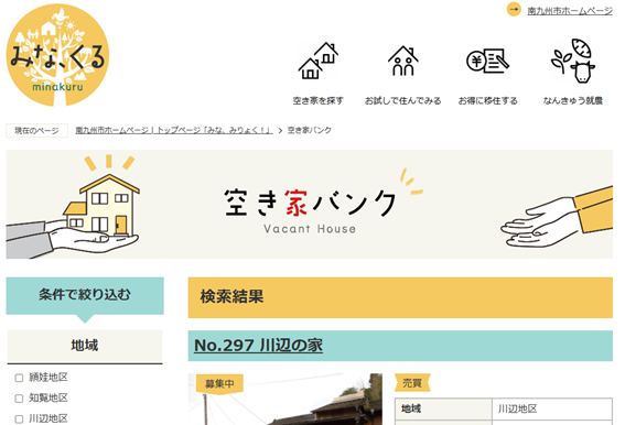 南九州市の空き家バンクのHP