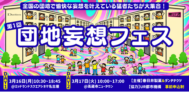 春日井製菓株式会社(本社:愛知県名古屋市、代表取締役:春日井大介、以下「当社」)の仲間づくりの専門部署「おかしな実験室」と、建築家・工務店による団地デザインユニット「ダンチテクツ」(本拠地:愛知県春日井市高蔵寺ニュータウン、井村正和・河合忠・酒井悠行・内藤太一・ナゴノダナバンク)は、団地を舞台にさまざまな社会課題を楽しく解決しようと奮闘している実践者たちを全国から招き、その情熱とノウハウをかき混ぜる2日間のイベント「団地妄想フェス」を、3月16日(月)と17日(火)に愛知で開催します。本イベントは、団地という社会の縮図から未来の地域づくりを考える試みです。