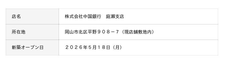 中国銀行(岡山市 頭取 加藤 貞則)では、かねてより新築しておりました「庭瀬支店」の新店舗オープン日が決まりましたので、お知らせします。