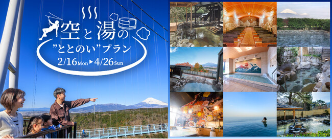 富士山を望む全長400mの大つり橋「三島スカイウォーク」(所在地:静岡県三島市、運営:株式会社フジコー、本社:静岡県三島市、代表:宮澤俊二)は、県内外の温泉・スパ全9施設とコラボレーションをした、絶景と温泉・スパで気持ちの発散を楽しめる「空と湯の“ととのい”プラン」を、2026年2月6日(金)より予約販売サイトにて順次公開いたします。本プランは2月16日(月)から4月26日(日)の期間限定でお楽しみいただけます。