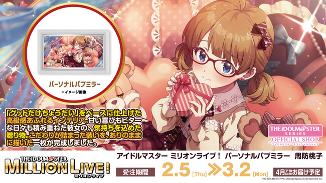株式会社バンダイナムコエクスペリエンスは、『アイドルマスター ミリオンライブ! パーソナルパブミラー』シリーズの新商品を2月5日(木)に発売します。今回は「周防桃子」が登場。同日より株式会社バンダイナムコエンターテインメントが運営するECサイト、「ASOBI STORE」にて期間限定の受注販売を開始します。