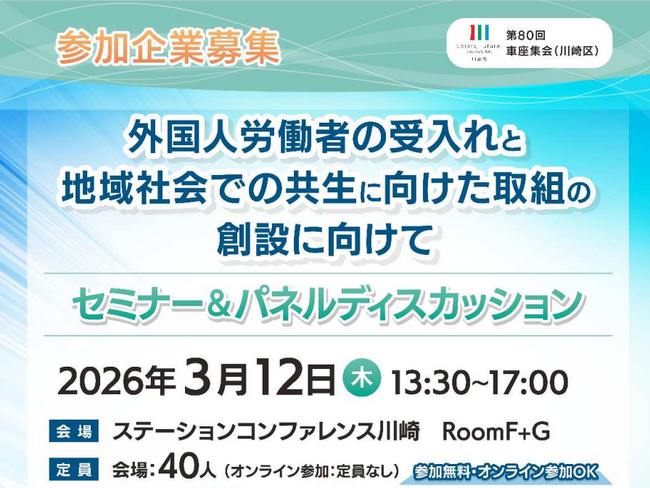 川崎市川崎区 : 参加募集 企業向けセミナー・車座集会『外国人労働者の受入れと地域社会での共生に向けた取組の創設に向けて』