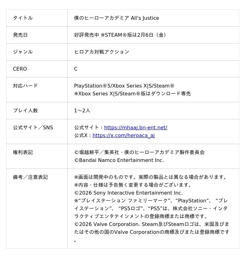 PlayStation(R)5/Xbox Series X|S版「僕のヒーローアカデミア All‘s Justice」は本日2月5日(木)に発売を迎えました(STEAM(R)版は明日2月6日発売)。