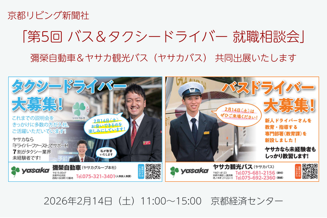彌榮自動車株式会社(ヤサカグループ本社、以下:彌榮自動車)ならびにヤサカ観光バス株式会社(以下:ヤサカ観光バス)は、2026年2月14日に行われる「第5回 バス&タクシードライバー 就職相談会 in 京都(主催:京都リビング新聞社、協力:京都府タクシー協会・京都府バス協会)」に共同で出展することをお知らせいたします。