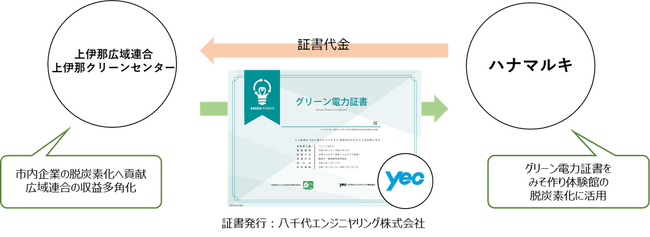 1. 地域経済循環の実現本事業は、伊那市に所在する上伊那クリーンセンターが再生可能エネルギー(バイオマス)により発電したグリーン電力に含まれる環境価値を、八千代エンジニヤリングがグリーン電力証書として発行し、ハナマルキが調達するものです。ハナマルキ株式会社が支払った費用は上伊那広域連合(伊那市、駒ケ根市、辰野町、箕輪町、飯島町、南箕輪町、中川村、宮田村)に渡り、地域の課題解決のために使われ、環境価値の地産地消と地域経済循環につながります。