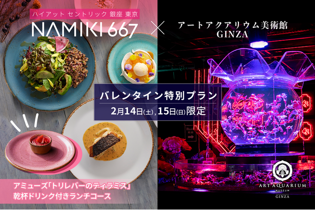 ホテル内3階のレストラン「NAMIKI667」で楽しむ贅沢ランチと、アートアクアリウム美術館入場券がセットになったバレンタイン特別コラボプランチケットを2月14日(土)・15日(日)の2日間限定で販売いたします。
