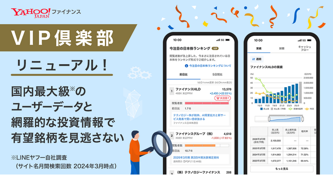 LINEヤフー株式会社(以下、LINEヤフー)が提供する金融情報総合サービス「Yahoo!ファイナンス」は、有料会員向けサービス「VIP倶楽部」をリニューアルしました。今回のリニューアルでは、ユーザーの閲覧データを活用した「今注目の日本株ランキング」や、2008年度以降の業績推移を一括で俯瞰できる業績グラフ機能の拡充、さらに金融資産1億円超の個人投資家のインタビュー記事やPER・PBRの過去推移データの提供など、新たなコンテンツを追加しました。これにより、銘柄の発見から分析、投資判断までのプロセスをより効率的に行える環境を提供します。