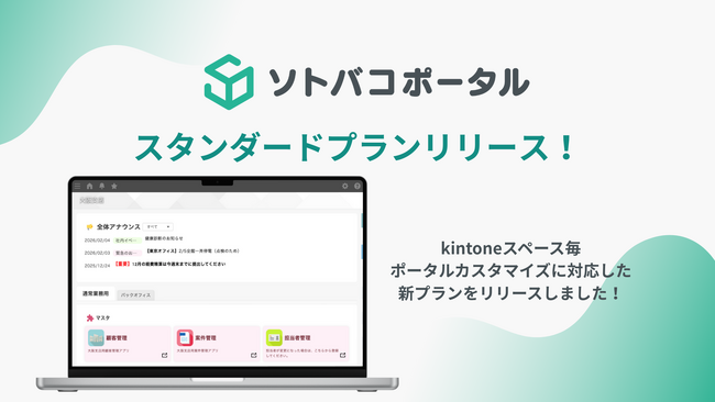 株式会社ソトバコ(本社:福岡県福岡市、以下「ソトバコ」)は、自社が提供するkintoneポータルカスタマイズツール「ソトバコポータル」において、2026年2月2日より 『スタンダードプラン』 をリリースしました。
