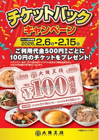 株式会社大阪王将(東京ヘッドオフィス:東京都品川区 代表取締役社長:岡本優一)が展開する餃子専門店「大阪王将」は、2026年2月6日(金)から15日(日)の期間限定で、500円(税込)の利用毎に100円のチケットを1枚プレゼントするキャンペーンを大阪王将店舗にて開催いたします。