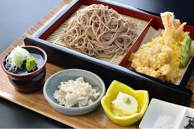 メイン料理:DDハナビラの天ぷらそば 特典:村杉温泉「ラジウム大露天風呂」での日帰り入浴