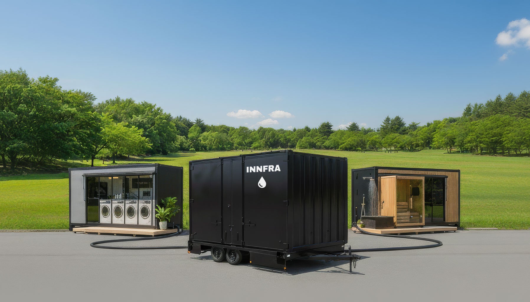なかでも、現地での水の確保、排水処理、再利用までを完結させる独自の水循環システム「INNFRA Water」は、上下水道が整備されていない地域や災害時においても機能するインフラとしての実装可能性を有しています。単なる機器導入にとどまらず、生活環境として長期的に成立させるための知見とオペレーションを含めて提供できる点が、INNFRAの大きな特長です。