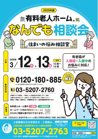 3月12日(木)・3月13日(金)の2日間、「有料老人ホームなんでも相談会~住まいの悩み相談室~」(後援:厚生労働省)を、有料老人ホーム等の入居者および入居希望者からの相談・苦情等を受ける目的で開催いたします。
