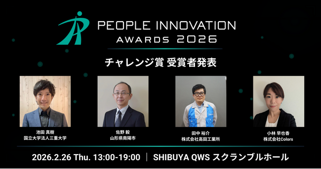 People Innovation Awards 実行委員会(事務局:一般社団法人日本デジタルトランスフォーメーション推進協会)は、2026年2月26日(木)に開催する「People Innovation Awards 2026 FINAL」において、多様な挑戦を讃える「チャレンジ賞」の受賞者4組を決定いたしました。