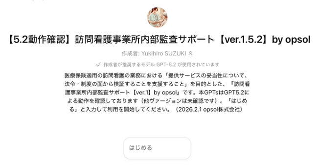 【概要】本ツールは、OpenAI社が提供するChatGPTのGPTs機能を活用して構築されており、GPT5.2にて動作確認を行ったものであり、訪問看護業務における自己点検支援ツールです。
