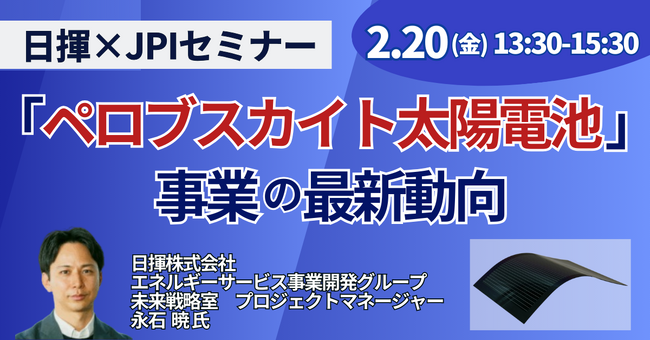 【JPIセミナー】「日揮(株)における ”ペロブスカイト太陽電池” 事業 その最新動向と今後の更なる展開について」2月20日(金)開催
