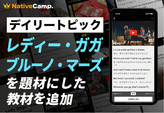 ネイティブスピーカーと回数無制限のオンライン英会話サービス「ネイティブキャンプ英会話」を展開する株式会社ネイティブキャンプ(東京都渋谷区 代表取締役:谷川国洋)は、2026年2月5日(木)、Lady GagaとBruno Marsによるコラボ楽曲「Die With A Smile」をテーマにした新教材を追加しました。