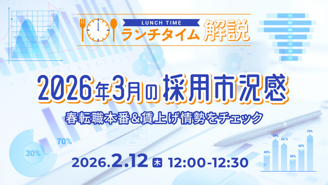 タイトル:ランチタイム解説 2026年3月の採用市況感 春転職本番&賃上げ情勢をチェック開催日時:2026年2月12日(木) 12:00 ~ 12:30 *10分前から入室可能