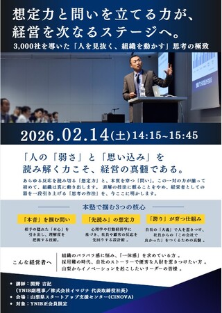 ブランディングコンサルティングを通じ、累計3,000社以上の企業成長に伴走してきた株式会社イマジナ(本社:東京都千代田区、代表取締役社長:関野吉記)は、2026年2月14日(土)、山梨県立スタートアップ支援センター(CINOVA)にて、経営者の「器」を一段引き上げる特別経営塾を開催いたします。