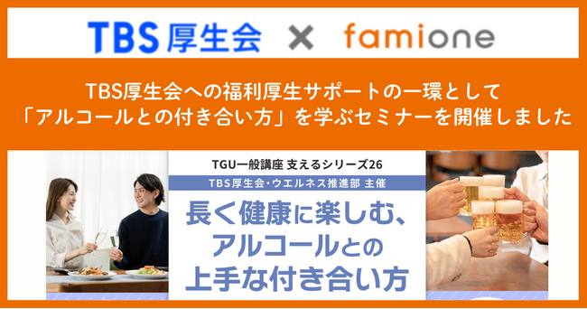 「子どもを願うすべての人によりそい 幸せな人生を歩める社会をつくる」をビジョンに掲げ、法人の従業員向け福利厚生や自治体の住民向け支援を行うヘルスケアサポートサービス「ファミワン」 https://famione.com/benefit/ などを展開する株式会社ファミワン(本社:東京都渋谷区、代表取締役:石川勇介)は、TBS厚生会・ウェルネス推進部が主催する「支えるシリーズ」第26回として、オンラインセミナー「長く健康に楽しむ、アルコールとの上手な付き合い方」を実施しました。