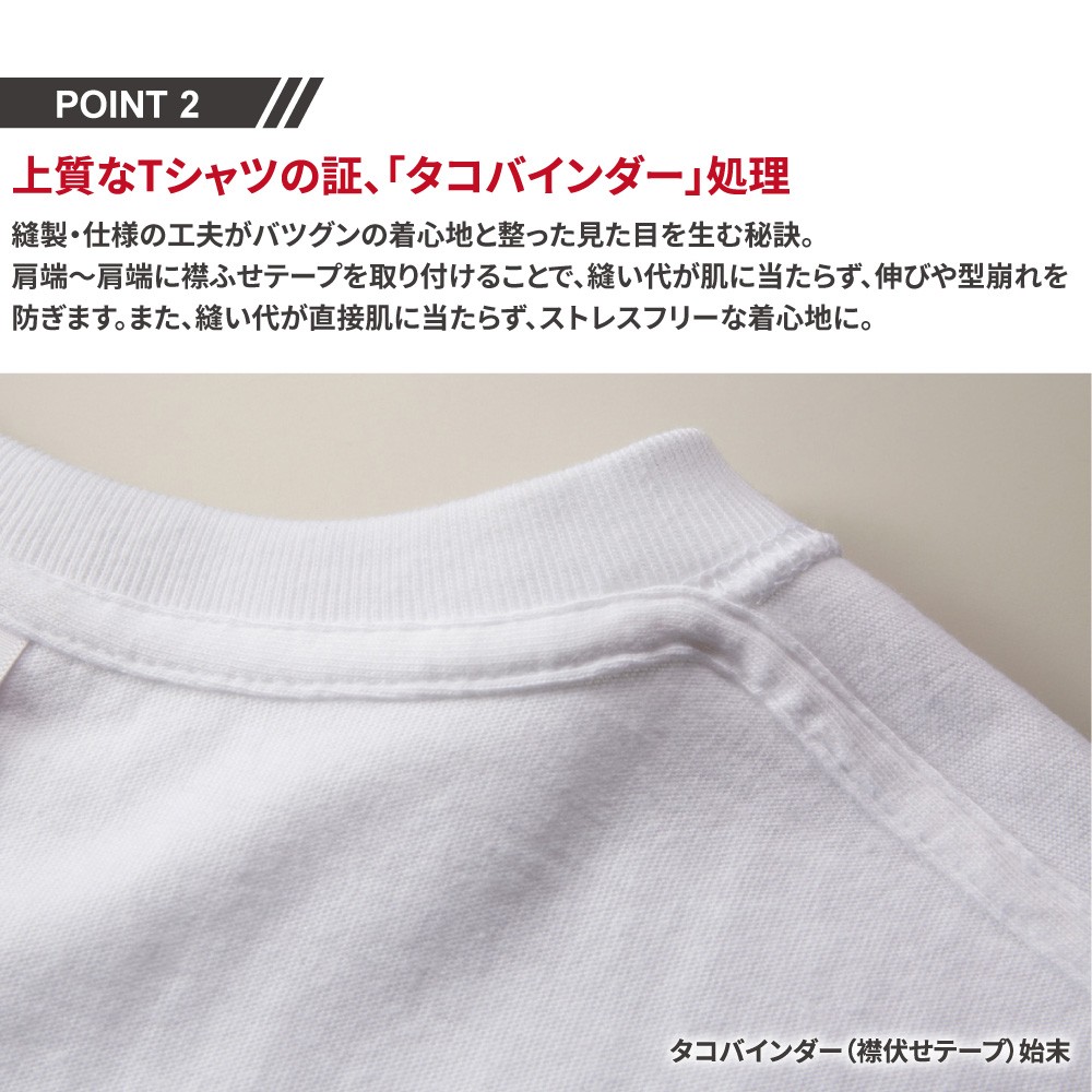 コットン100%の5.6オンスの極厚で丈夫な生地を使用し、「よれない・透けない・長持ちする」という三拍子が揃った上質な一枚に仕上げています。さらに、丈夫な首まわりを実現するため、首まわりの縫製には「ダブルステッチ」を採用しており、長年愛用いただいてもきちんとした首まわりを保ちます。