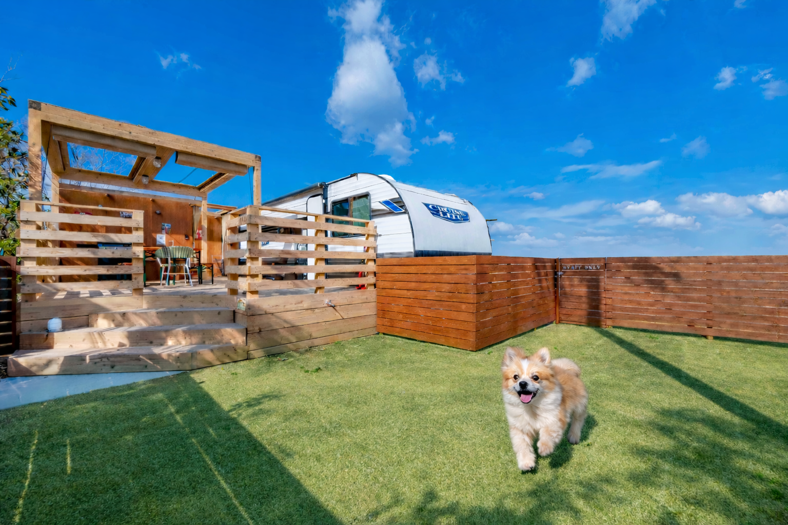 宿泊できるトレーラーには専用ドッグランを備えています。
