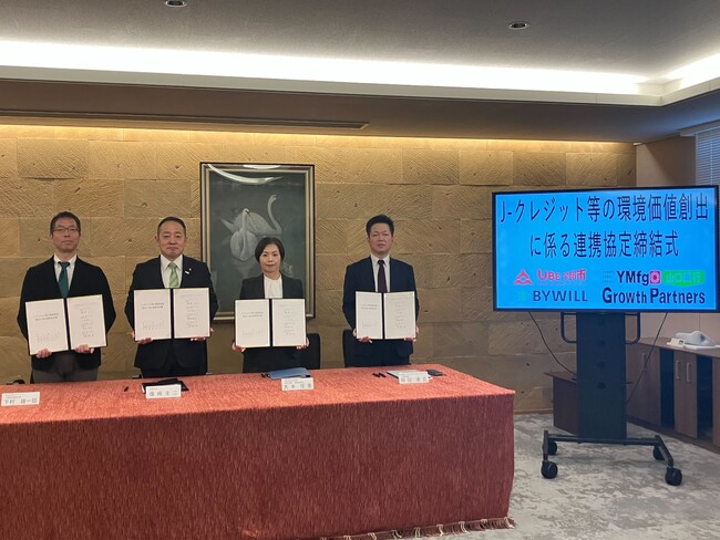 「GXをやりたくなる世界」を目指し、環境価値を活用した経済循環を推進する株式会社バイウィル(本社:東京都中央区、代表取締役社長:下村 雄一郎、以下「バイウィル」)は、山口県宇部市(市長:篠崎 圭二、以下「宇部市」)、株式会社山口銀行(本店:山口県下関市、取締役頭取:曽我 徳將、以下「山口銀行」)、 株式会社YMFGグロースパートナーズ(本社:山口県下関市、代表取締役:禅院 康広)と、「J-クレジット等の環境価値創出に係る連携協定」を締結しました。