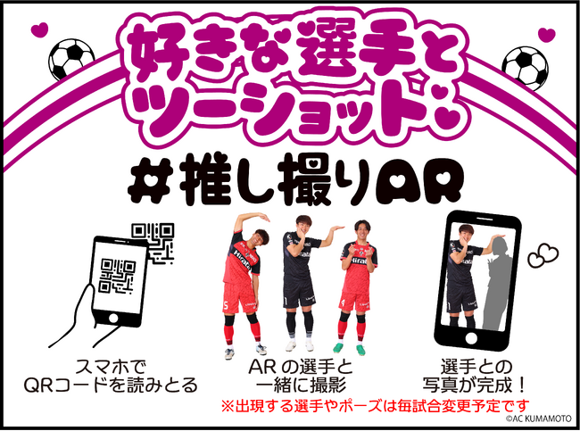 スタジアム内外の 5 か所に設置された QR コードをスマートフォンで読み込むと、カメラの中にロアッソの選手が出現し、まるで選手と至近距離にいるようなドキドキ・わくわくのツーショット体験をお楽しみいただけます。出現する選手やポーズは毎試合変更予定です。
