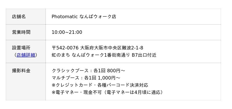 フラッグシップショップのある東京・渋谷を中心に、急速に人気を集めているセルフフォトブランド「Photomatic」。プロ仕様の機材と洗練されたライティングによって生み出される高品質な撮影体験に、Photomatic独自の感性が組み合わさった「セルフフォト」が、感度の高い若者の間で新しいカルチャーとなっています。これまで、関西エリアではフォトブース単体の設置のみでしたが、多くのお客様のご要望を受け、Photomaticの世界観を存分に体感できる実店舗として「Photomatic なんばウォーク店」を出店いたします。[画像2: https://prcdn.freetls.fastly.net/release_image/132579/156/132579-156-83a8888faf81039b0090dc01c3721e74-3900x3120.jpg?width=536&quality=85%2C75&format=jpeg&auto=webp&fit=bounds&bg-color=fff ]