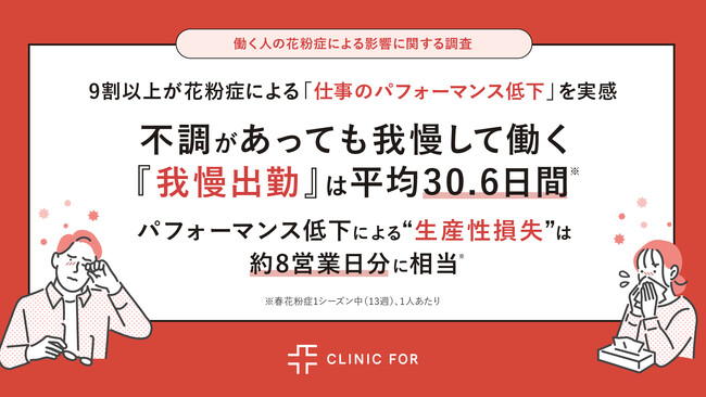 対面診療とオンライン診療を展開する「クリニックフォアグループ」(以下クリニックフォア)は、働く花粉症の人309名を対象に「働く人の花粉症による影響に関する調査」を実施しました。