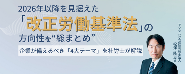 名称:2026年以降を見据えた「改正労働基準法」を“総まとめ”企業が備えるべき「4大テーマ」を社労士が解説