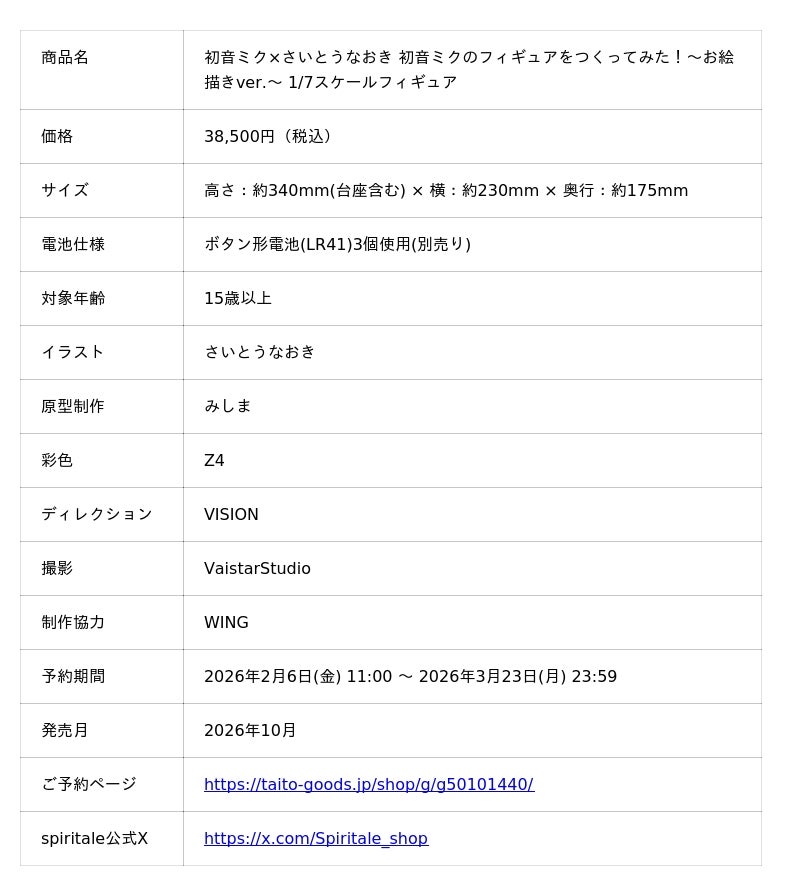 株式会社タイトー(本社:東京都新宿区、以下タイトー)は、魅力的な表情の再現と細部のディテールまでこだわり抜いた高品質キャラクターフィギュアを展開するブランド「spiritale (スピリテイル)」の新商品として、「初音ミク×さいとうなおき 初音ミクのフィギュアをつくってみた!~お絵描きver.~ 1/7スケールフィギュア」を発売いたします。2026年2月6日(金)11:00より、ECサイト「TAITO GEAR&GOODS」(URL:https://taito-goods.jp/shop/default.aspx)にて予約受付を開始します。