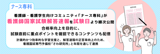 看護師・看護学生向けコミュニティ「ナース専科」が看護師国家試験解答速報を試験日より順次公開。合格率向上を目的に、試験直前に重点ポイントを確認できるコンテンツも配信