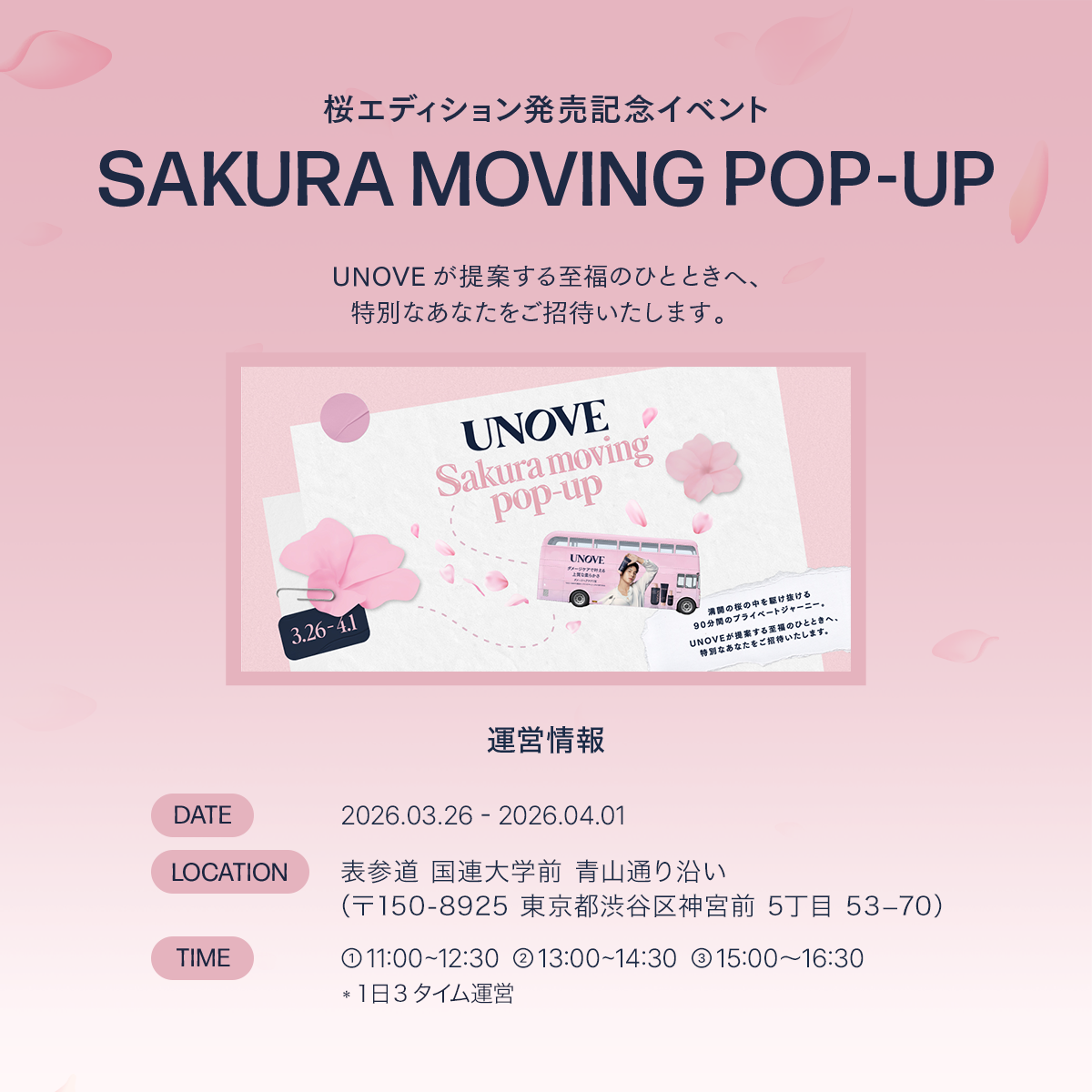 UNOVE「桜エディション」の発売を記念し、抽選でご当選された方のみをご招待する完全招待制イベント「SAKURA Moving POP-UP」を、2026年3月26日(木)~4月1日(水)の期間限定で開催いたします。[画像6: https://prcdn.freetls.fastly.net/release_image/140628/25/140628-25-7d58119082e0eeef6a397d9c462ef38b-1200x1200.png?width=536&quality=85%2C75&format=jpeg&auto=webp&fit=bounds&bg-color=fff ]