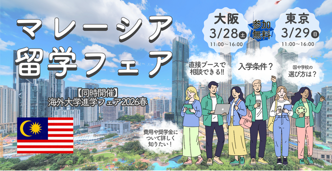 Zenken株式会社(所在地:東京都港区、代表取締役社長:林 順之亮、以下 Zenken)と業務委託契約を結んでいる一般財団法人 海外留学推進協会は、マレーシアの名門大学群を招聘し、「マレーシア留学フェア2026春」を3月28日(土)に大阪、3月29日(日)に東京で開催いたします。