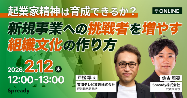 【起業家精神を生むメソッド】東海テレビ × Spready が2/12(木)「新規事業への挑戦者を増やす組織文化の作り方」をテーマにしたオンラインイベントを開催!