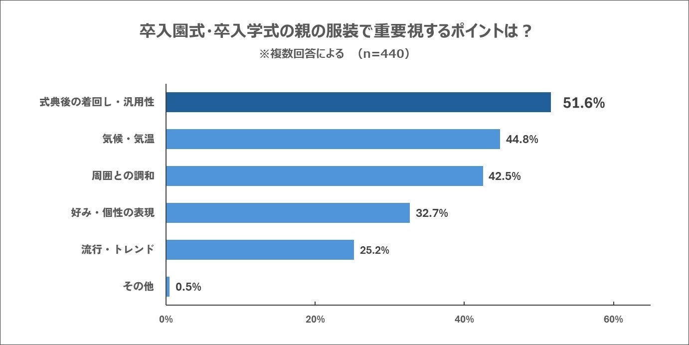 - 卒入園・卒入学式の親の服装で重要視するのは?という問いに対し、「式典後の着回し・汎用性」が51.6%で最多。 「周囲との調和(42.5%)」を上回る結果に。