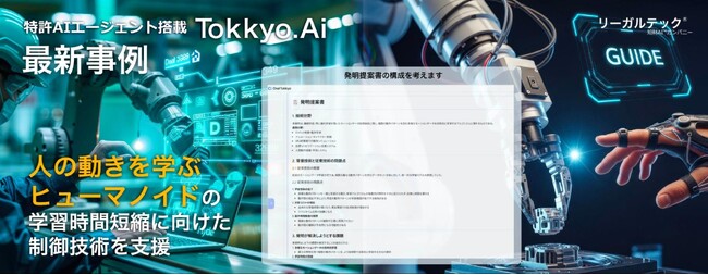 リーガルテック株式会社(本社:東京都港区、代表取締役社長:平井智之)は、人間と同様の身体構造を持ち、人の動作を再現するロボットであるヒューマノイドの模倣学習効率化技術に関する特許検討において、同社が提供する特許支援AIプラットフォーム「MyTokkyo.Ai」が活用されたことを発表する。本事例では、人間の動作を学習させる過程において、膨大なモーションデータ処理の非効率により訓練期間が長期化していた課題に対し、学習時間短縮を目的とした制御・学習方式について、特許化可能な発明要素の抽出および発明提案書の整理を行った。