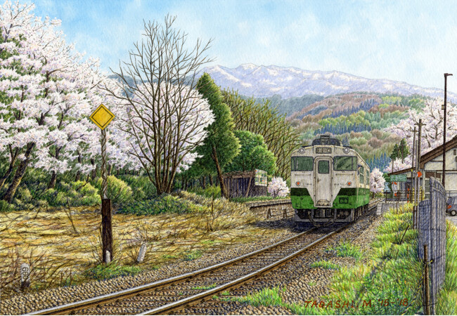 提供:松本忠 鉄道風景画「春、歩む」只見線 会津柳津 (福島県柳津町)