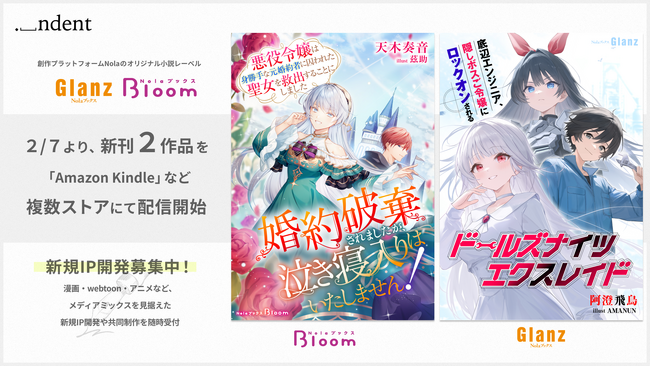 65万人を超える作家と企業をつなぐ創作プラットフォーム「Nola(ノラ)※1」を提供する株式会社indent(本社:東京都千代田区、代表取締役社長:釜形勇気 以下、「indent」)は、このたび、オリジナル小説レーベル「NolaブックスGlanz」(少年・青年ジャンル)「NolaブックスBloom」(少女・女性ジャンル)の新刊2作品を、2026年2月7日(土)より、電子書籍ストア「Amazon Kindle」など複数ストアにて単巻配信いたします。