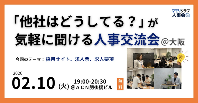 【2/10(火)19:00~大阪開催・無料イベント】人事・採用の「他社はどうしてる?」が気軽に聞ける交流会|トークテーマ:採用サイト・求人票・求人要項