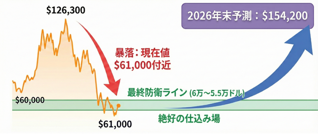 短期的には「極限の恐怖」状態にありますが、この6万ドル~5万5000ドルのゾーンは、2026年末の15万ドル超えを目指す上での「絶好の仕込み場」になる可能性が高いと判断します。