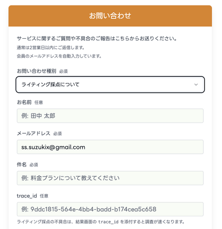※お問い合わせ種別で「ライティング採点について」を選ぶと、trace_idの入力欄が表示されます。