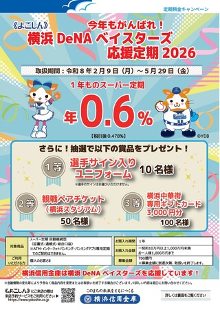 横浜信用金庫(横浜市中区 理事長 春日 隆)は、2026年も横浜DeNAベイスターズを地域の皆様と応援するため、期間中に新たに定期預金10万円以上お預入れいただいた方を対象として、「《よこしん》横浜DeNAベイスターズ応援定期2026」の取扱いを開始します。