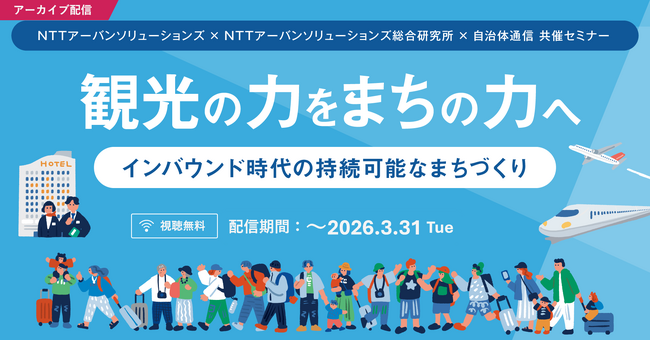 2026年1月28日に開催したNTTアーバンソリューションズ×NTTアーバンソリューションズ総合研究所×自治体通信共催「観光の力をまちの力へ ―インバウンド時代の持続可能なまちづくり」につきまして、好評の声を多くいただきましたので、この度期間限定でアーカイブ配信を実施いたします。