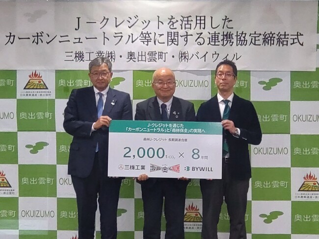 「GXをやりたくなる世界」を目指し、環境価値を活用した経済循環を推進する株式会社バイウィル(本社:東京都中央区、代表取締役社長:下村 雄一郎、以下「バイウィル」)は、島根県奥出雲町(島根県仁多郡奥出雲町、町長:糸原 保、以下「奥出雲町」)および三機工業株式会社(本社:東京都中央区、代表取締役社長:石田 博一、以下「三機工業」)と、奥出雲町が創出したJ-クレジット(森林クレジット)の活用に関する連携協定を締結したことをお知らせします。