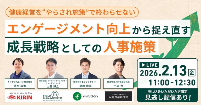 株式会社エンファクトリー(東京都千代田区、代表取締役社長CEO加藤健太)は、2026年2月13日(金)11:00-12:30にて、『健康経営を“やらされ施策”で終わらせない~エンゲージメント向上から捉え直す成長戦略としての人事施策~』セミナーに登壇します。(詳細はこちら:https://wellwa.jp/seminar_260213?organizationId=1780)