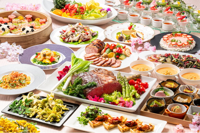 「スカイレストラン ハレアス」では、春の食材をふんだんに取り入れた春メニューをご用意いたしました。オードブルには、やわらかな豚肩ロースをさっぱりと味わう「キャベツと豚肩ロースの冷しゃぶ」をはじめ、山菜と鴨を梅の酸味で仕上げた一品や、「菜の花とシーフードのマリネ」など、春らしい彩りと軽やかな味わいを揃えました。パスタには、コク深いミートソースを絡めたフェットチーネを、スープには人参の甘みを引き出したポタージュをご用意。メイン料理は、香ばしく焼き上げた「豚ロースのロースト」や「白身魚のソテー フキみそソース」を中心に、「キッシュ」「山菜のフリット」「あさりとブロッコリーのアヒージョ」など、多彩な料理をラインナップしています。さらに中華メニューでは、「豚タンと筍の和え物」や「エビの甘辛炒め」、香り豊かな「桜エビ炒飯」、キャベツと魚介の旨みが広がる塩ラーメン、「点心盛り合わせ」など、和洋中の魅力を一度にお楽しみいただけます。春の彩りと旬の味覚を詰め込んだ、ハレアスならではのお料理をご堪能ください。[画像2: https://prcdn.freetls.fastly.net/release_image/78364/94/78364-94-b352a7d4176dea8fc2851c84989820af-1600x1067.jpg?width=536&quality=85%2C75&format=jpeg&auto=webp&fit=bounds&bg-color=fff ]