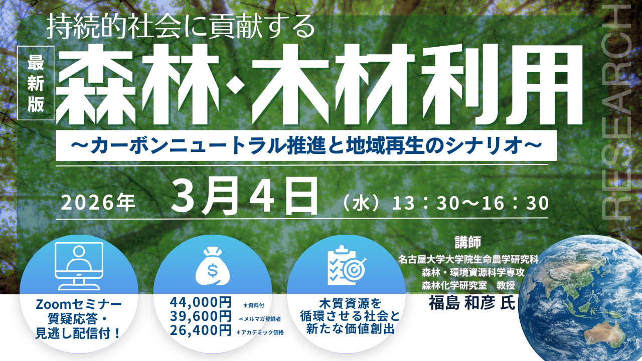 【ライブ配信/Zoom】「持続的社会に貢献する森林・木材利用 ~カーボンニュートラル推進と地域再生のシナリオ~」セミナー開催!3月4日(水)主催:(株)シーエムシー・リサーチ